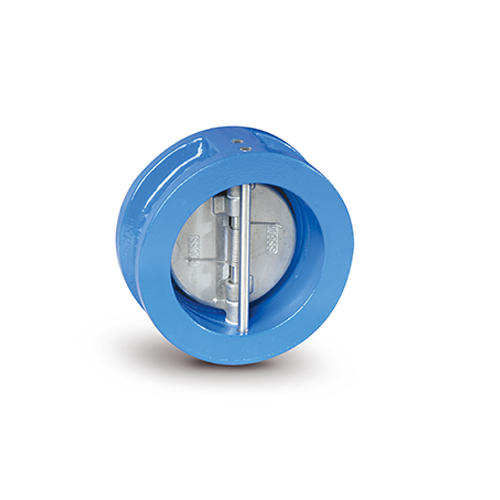 - Запорным устройством в нём служат две створки, закреплённые на оси находящейся по центру проходного сечения. При перекрытии среды, диск за счет силы пружины опускается на проходное сечение, где посредством уплотнения ЭПДМ достигается 100% герметичность.
